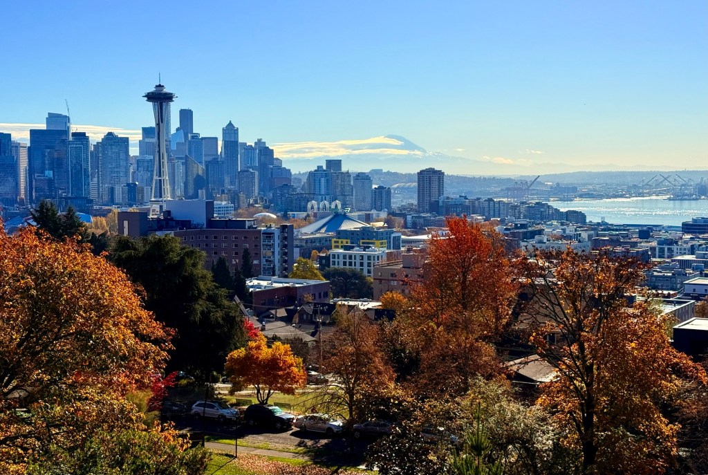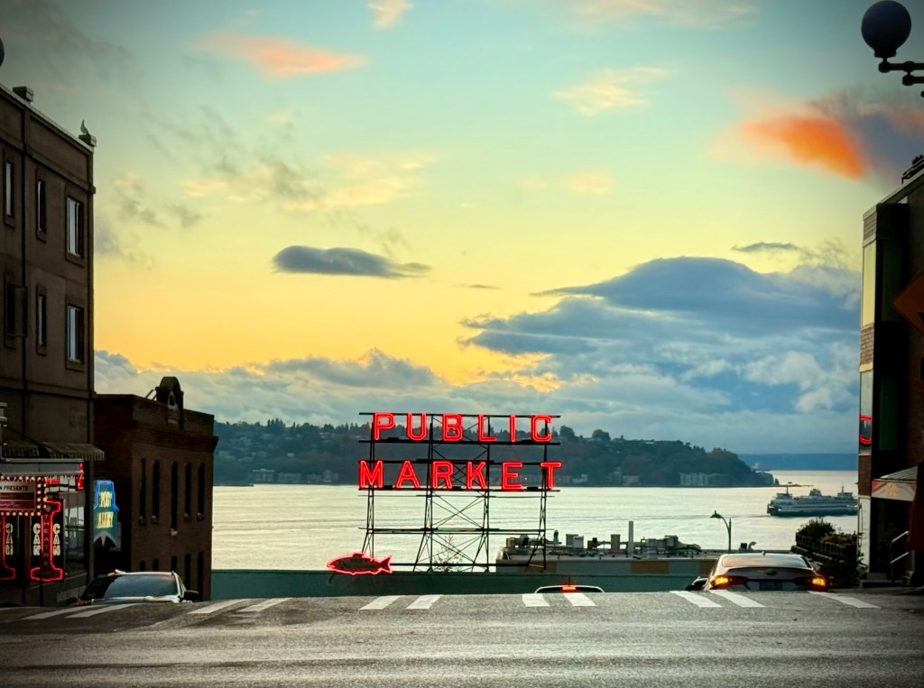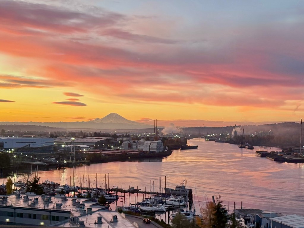 Looking south down the Duwamish Waterway towards Mt Rainier at sunrise. Admiring the view of Downtown from Kerry Park. Looking out towards Elliot Bay from Pike Place. Walking through the hidden gem that is Waterfall Garden Park.